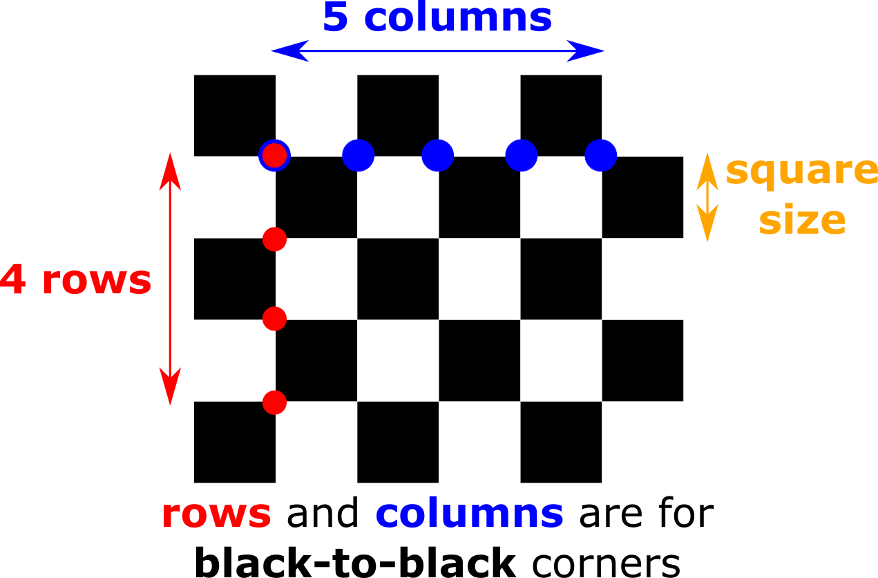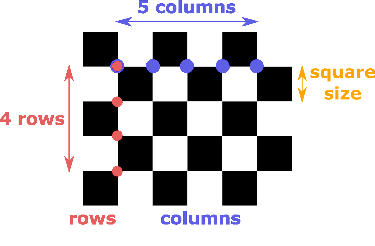 Rows and columns refer to the number of black-to-black corners, not the number of squares. For the recommended checkerboard and the example below, this is 4 rows and 5 columns.